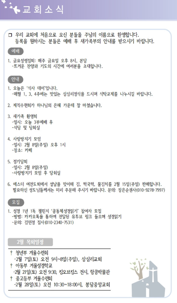 | 상심리교회 2026년 2월8일 주보 (0) | 2026.02.07 |
