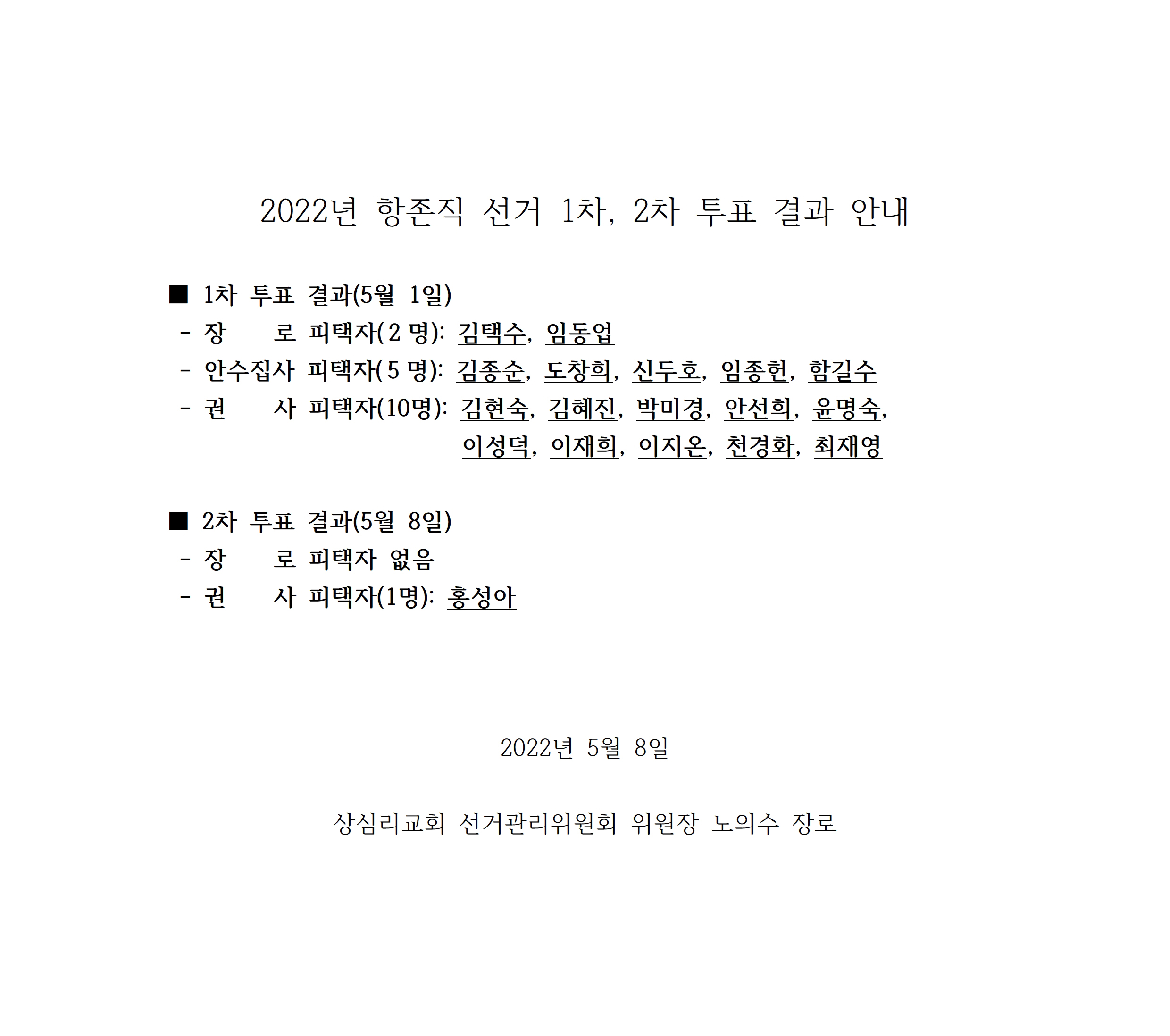 2022년도 항존직 1차, 2차 투표 결과 안내